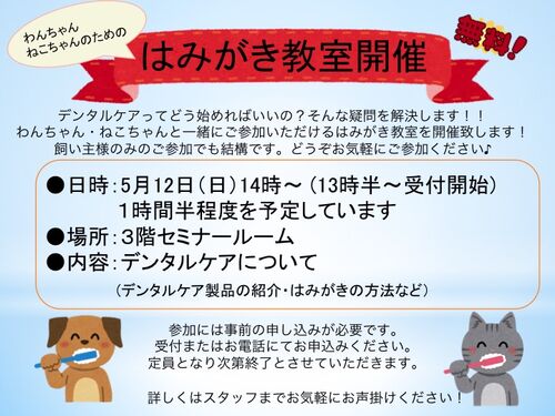 ゴールデンウィーク中の診療については、下記の通りとさせて頂きます。 [本院] 4月30日(火)、5月1日(水)午後休診 *ペットホテル対応しております。*急患の方や何かお困りのことなどありましたら、ご相談ください。 その他は通常通り診療しております…