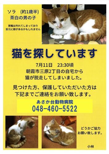 猫の「ソラちゃん」が迷子になっています。 1才半の男の子の猫ちゃんです。 些細な情報でも結構です。お心当たりの方は当院までお知らせください。 どうか皆様のご協力をお願いいたします。 電話048-460-5522