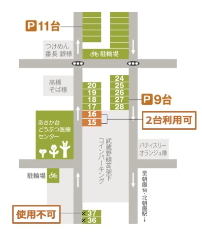 「北朝霞東弁財第2駐車場」にて時間制駐車場と月極駐車場の車室配置が変更されることに伴い、当院駐車場No.36・37は使用不可となり、No15・16に変更されることになりました。